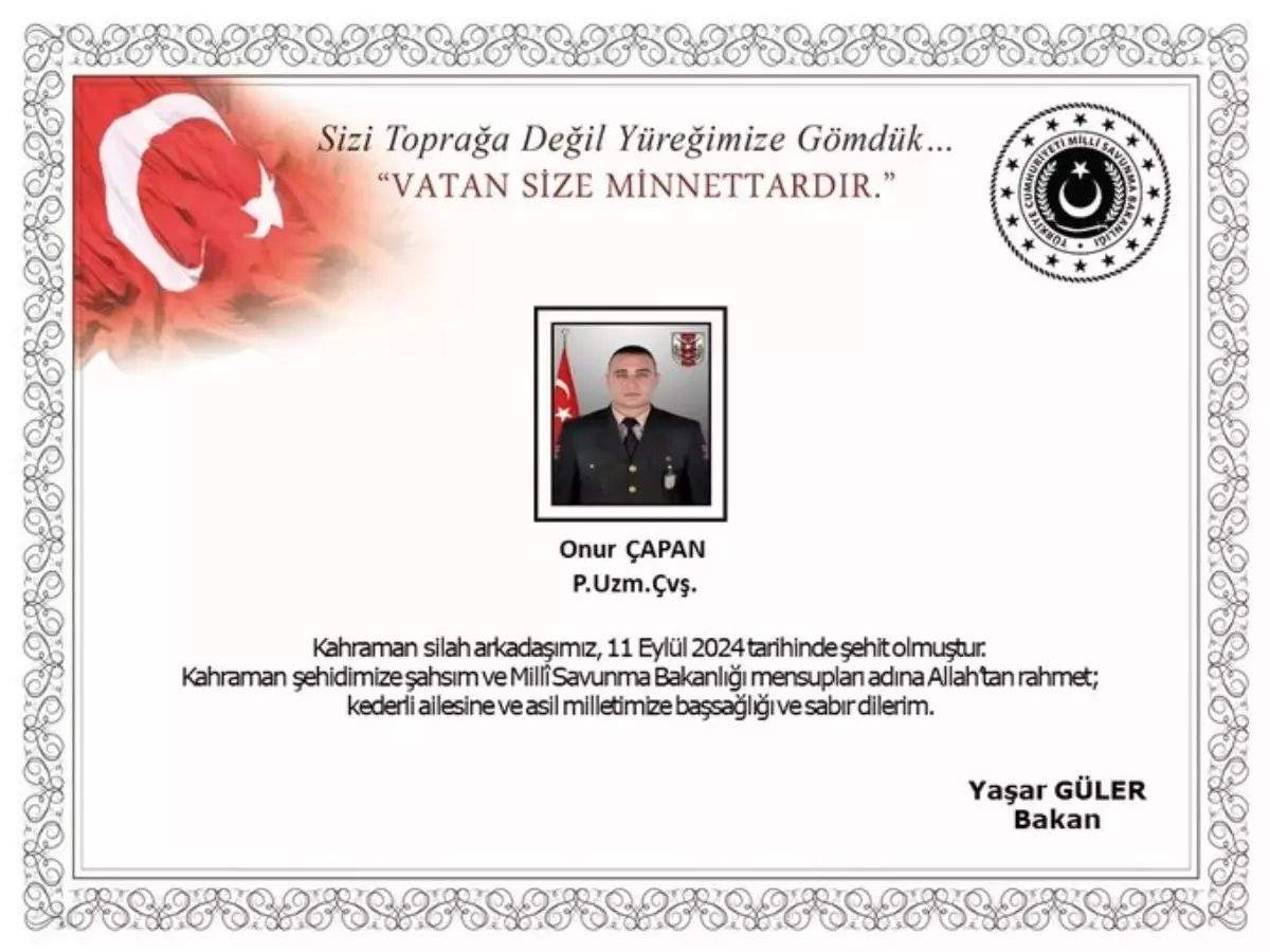 MSB’den yapılan yazılı açıklamada, “Zeytin Dalı Harekatı bölgesinde, 11 Eylül 2024 tarihinde, kahraman silah arkadaşımız P.Uzm.Çvş. Onur ÇAPAN, meydana gelen silah kazası sonucu şehit olmuştur. Bizleri derin bir acı ve üzüntüye boğan bu olayda hayatını kaybeden aziz şehidimize Allah’tan rahmet, kederli ailesine, Türk Silahlı Kuvvetleri ile asil milletimize başsağlığı ve sabır dileriz” ifadelerine yer verildi.