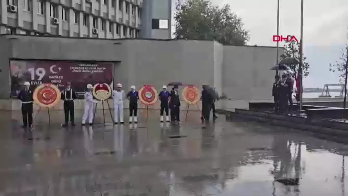 ZONGULDAK’ta etkili olan sağanak nedeniyle Gaziler Günü kapsamında Valilik binasında düzenlenen törende, bayrağı selamlayan ve çelenk taşıyan gazilere, korumalar ve görevliler tarafından şemsiye tutuldu.