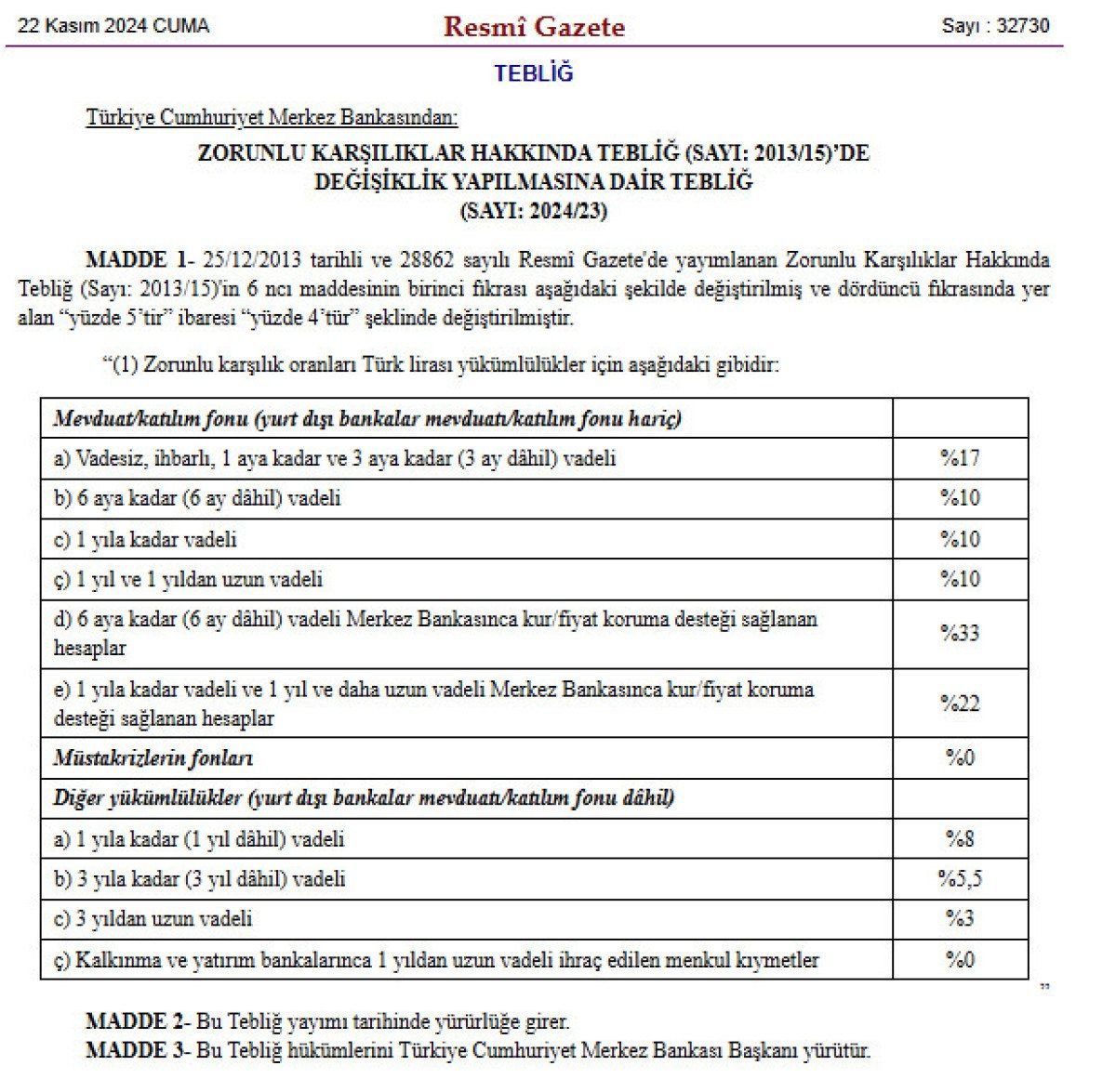 TCMB’den yapılan duyuruya göre, Türk lirası (TL) mevduat hesaplarına uygulanan zorunlu karşılık oranları ile yabancı para (YP) mevduat için TL cinsinden tesis edilmesi gereken zorunlu karşılık oranı değiştirildi.